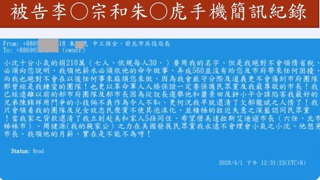 李傳侯提及李文宗收到朱亞虎的簡訊「小沈十分小氣的捐210萬要用我的名字、但是我絕對