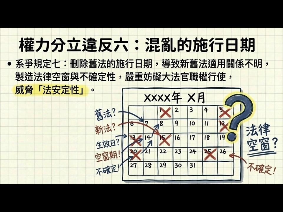 序的合法性。他擔憂未來大法官會持續透過這種方式,針對執政黨不願執行的法律(如年改