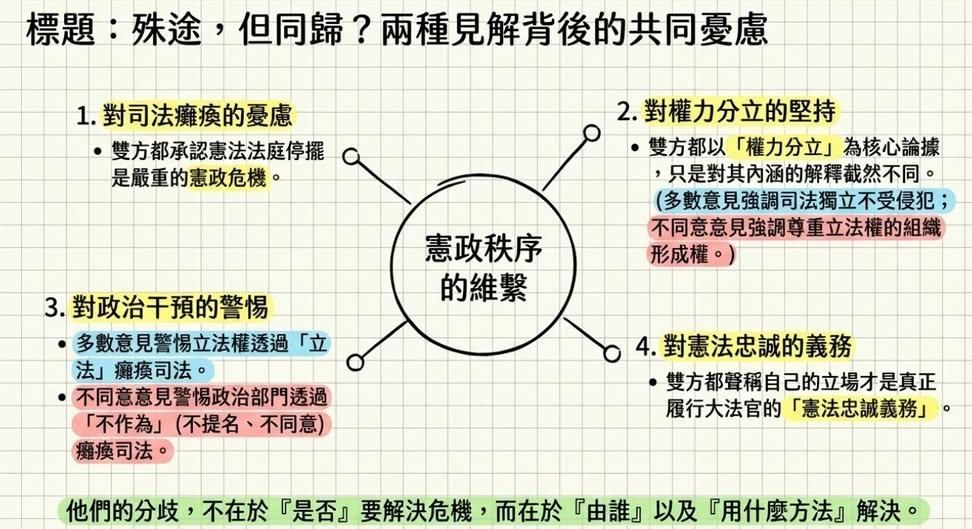 老師認為這幾位大法官已偏離司法專業,轉向以政治信仰為主導,扭曲了法治國家組織與程