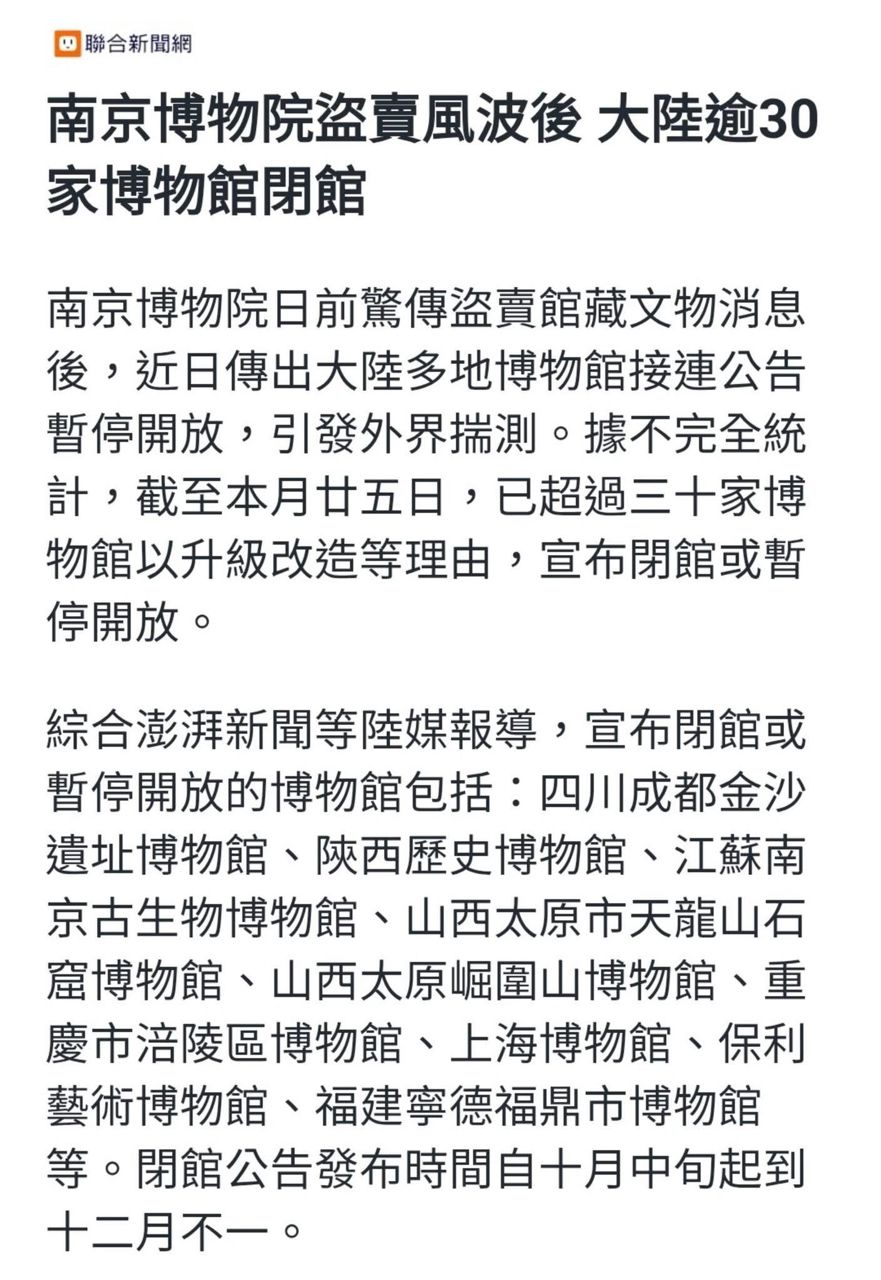消息一爆出來後,中國各地博物館立刻大規模宣布停業。