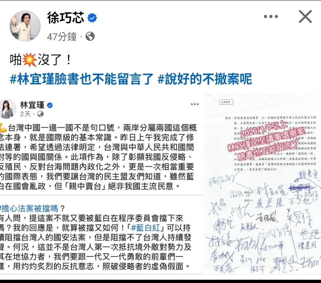 林宜瑾在臉書上否認撤案,轟藍白造謠