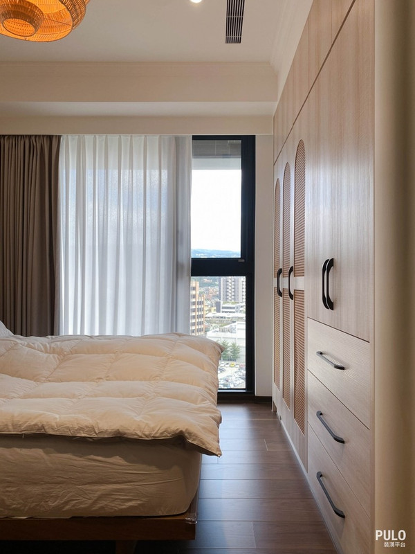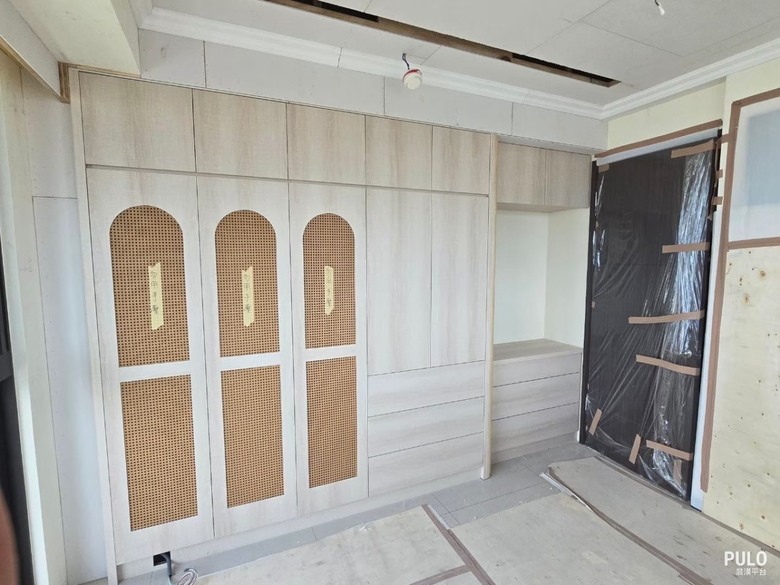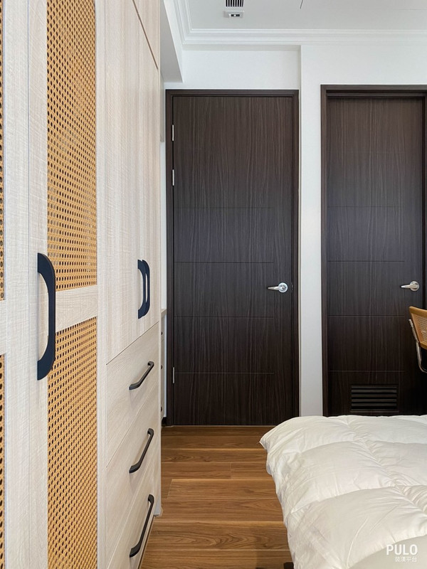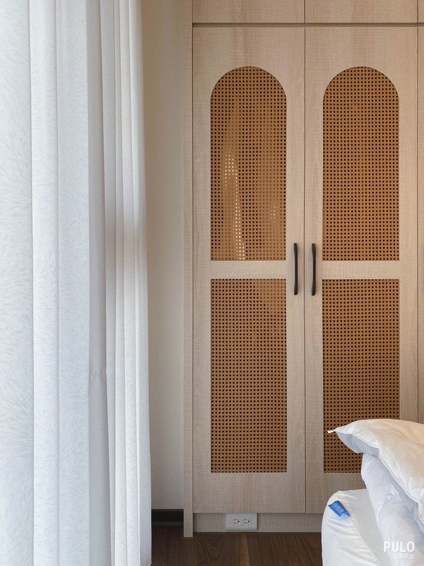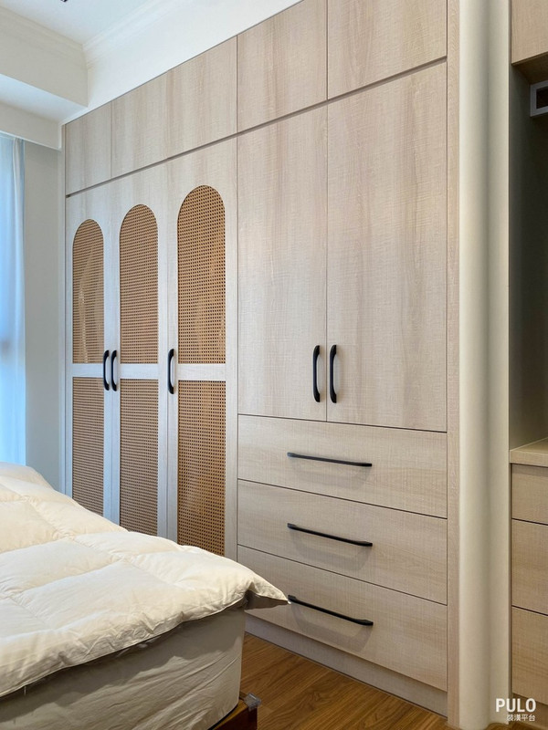 主臥的衣櫃延續了玄關的風格,同樣採用浮雕木紋搭配藤編門片,材質一致,整體感也更