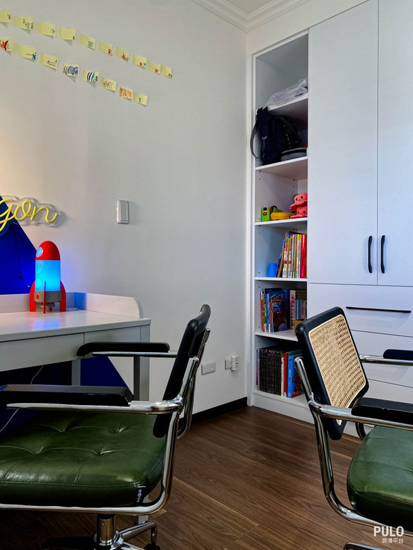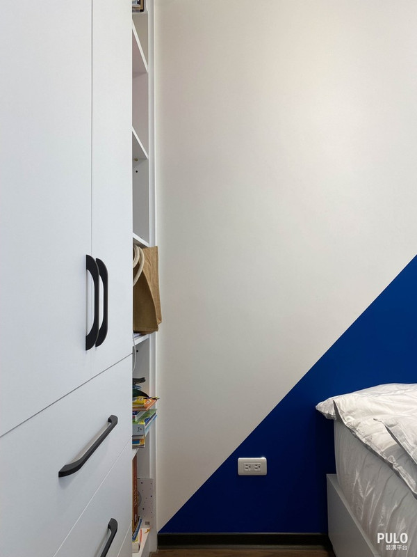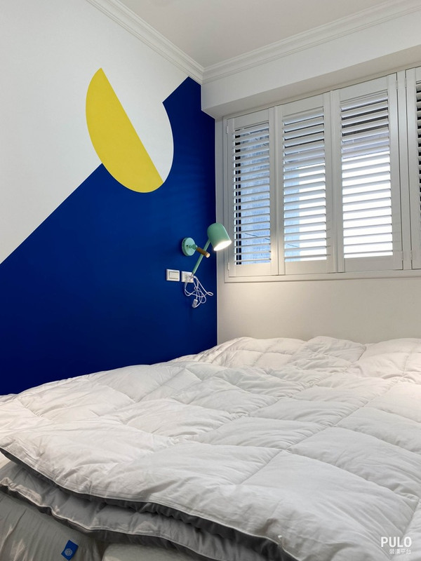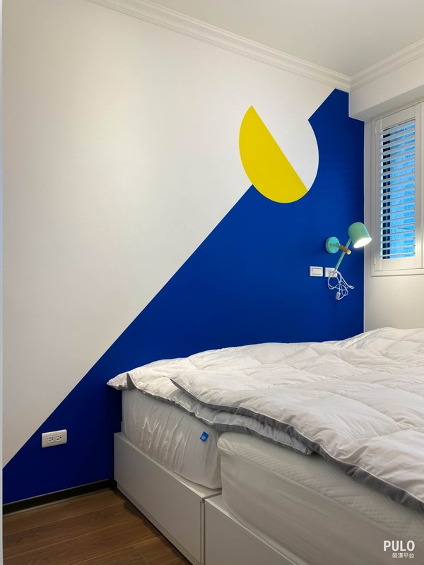 次臥延續相同的色調,牆面同樣使用黃、藍雙色處理,搭配簡單的床組和收納,適合小孩