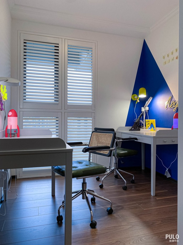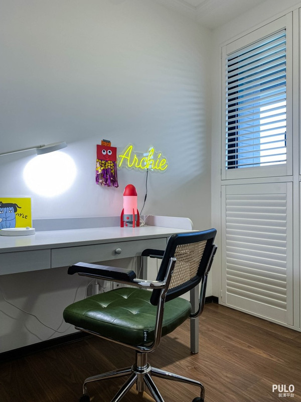 書房的色調與客廳一致,整體維持簡單乾淨,主要利用傢俱和軟裝來做出區隔。
