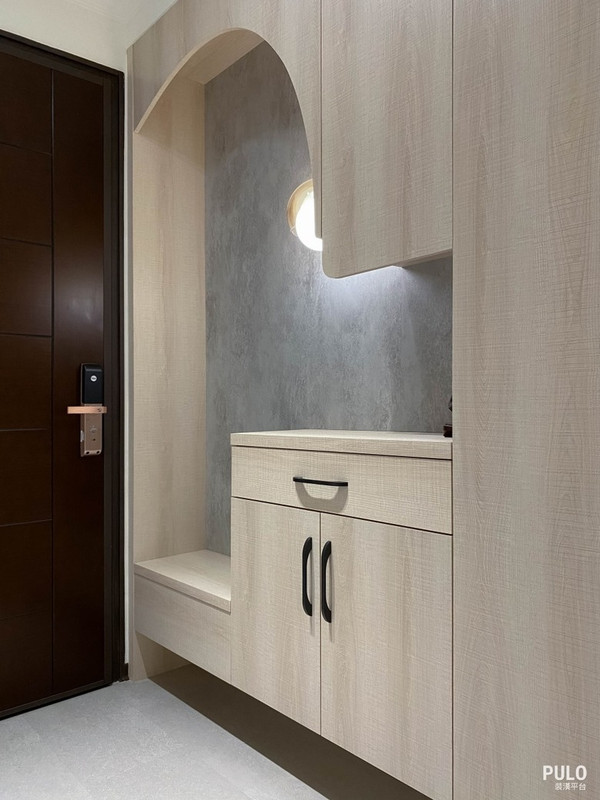 一進門就是玄關區,設計師在這裡規劃了一座收納櫃體,不僅方便放鞋、掛包,也明確拉