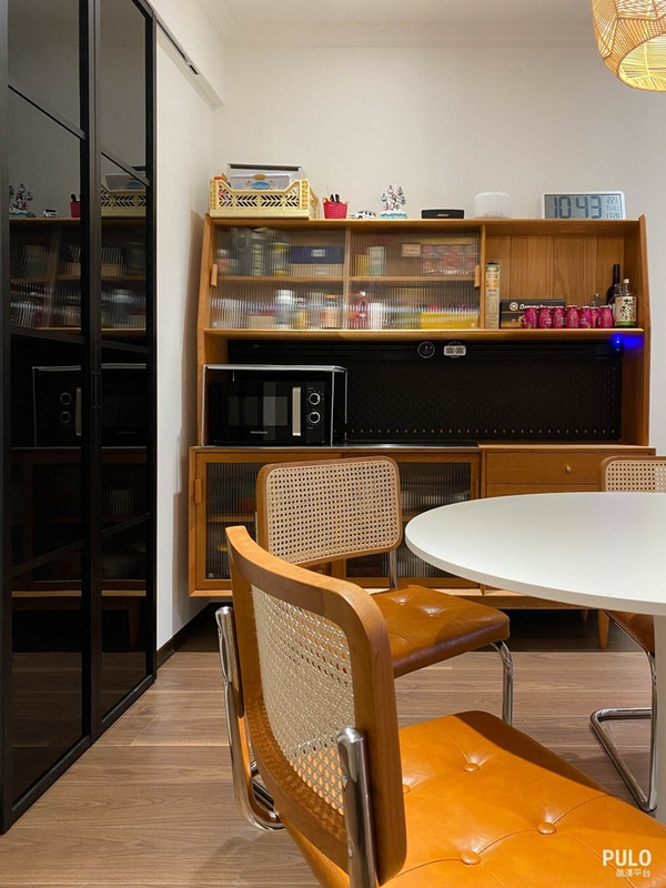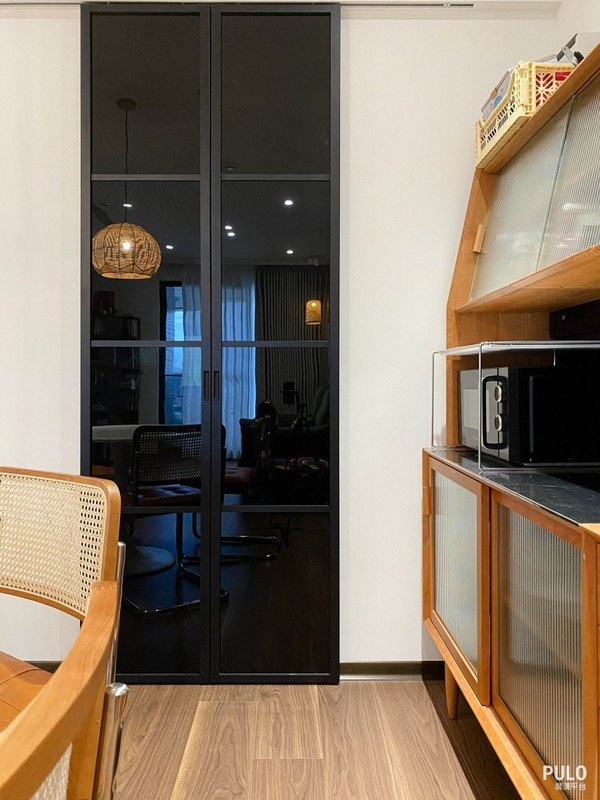 餐桌旁是通往廚房的出入口,原本的門片改為黑色鋁框玻璃拉門,拉開時不占空間,收起