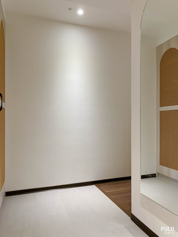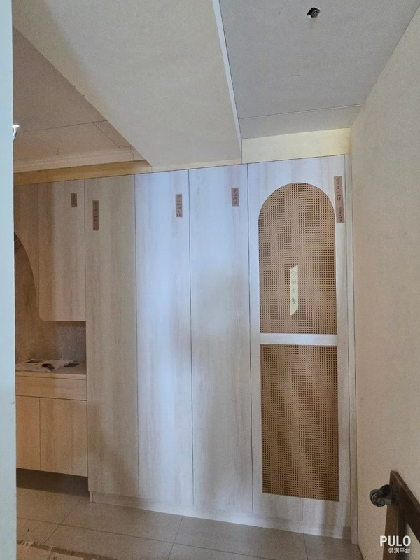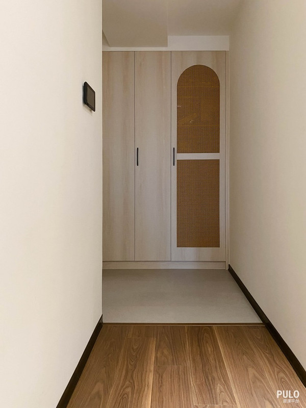 帶有細緻紋理,局部櫃門則改用藤編材質,增加了一點透氣感,也讓整體不會太單一。