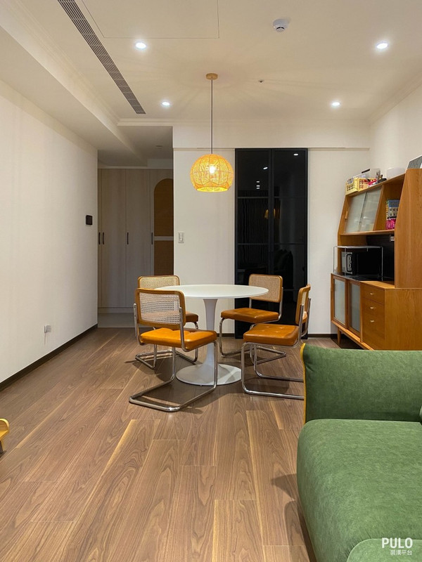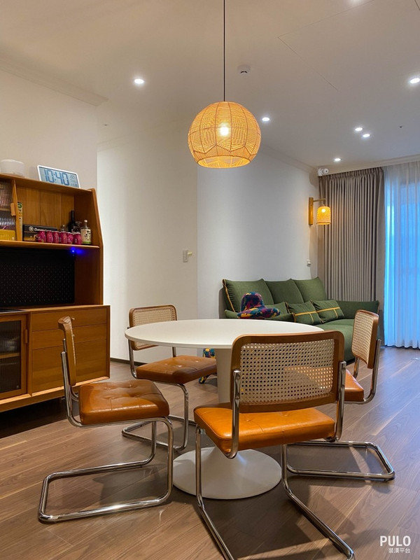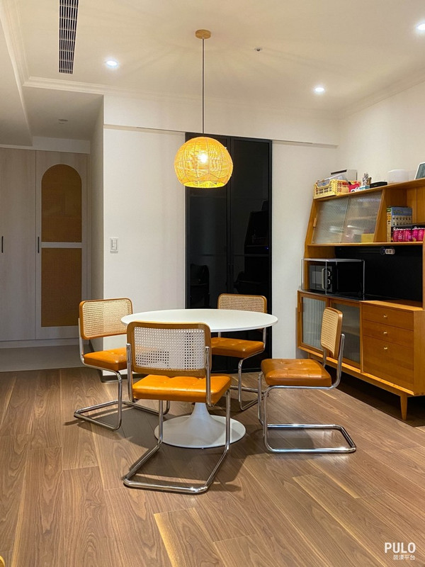 櫃體邊角做了圓弧收邊,搭配屋主特別挑選的吊燈,整體氛圍多了一點柔和的調性。