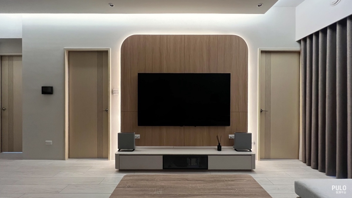 圓弧造型的電視牆背板還特別加上間接照明,搭配天花板層次中藏入的光源,整體光線更