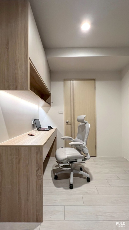 臥室則延續大地色系,系統衣櫃與書桌增加了實用機能之外,也讓整體風格更統一,簡約