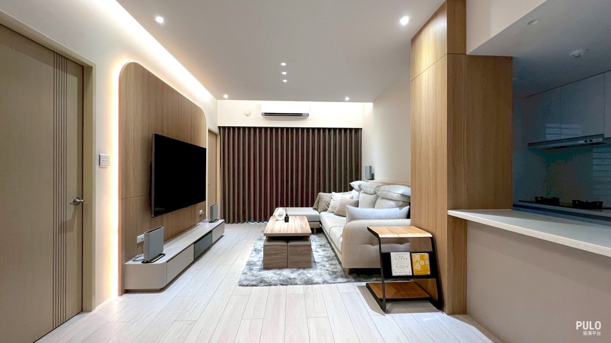 原本室內就鋪設了淺色木地板,這次搭配電視牆與電器櫃所選用的暖木色系,讓客廳呈現