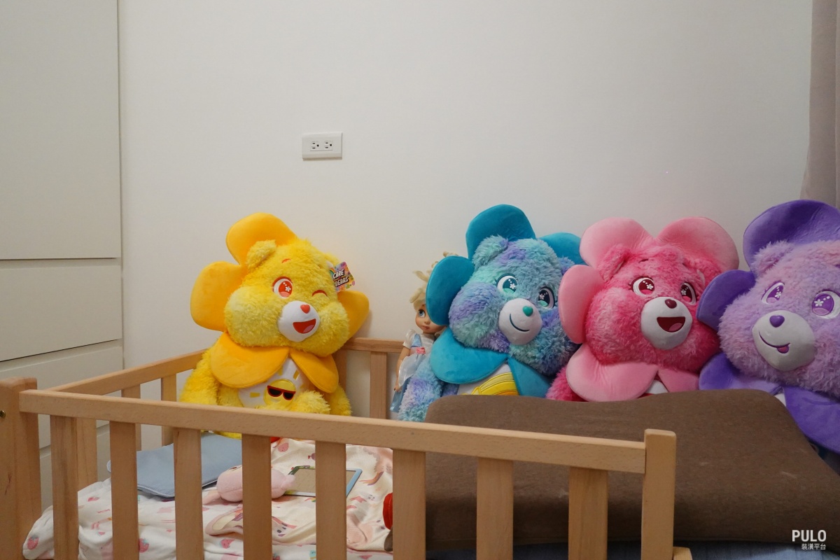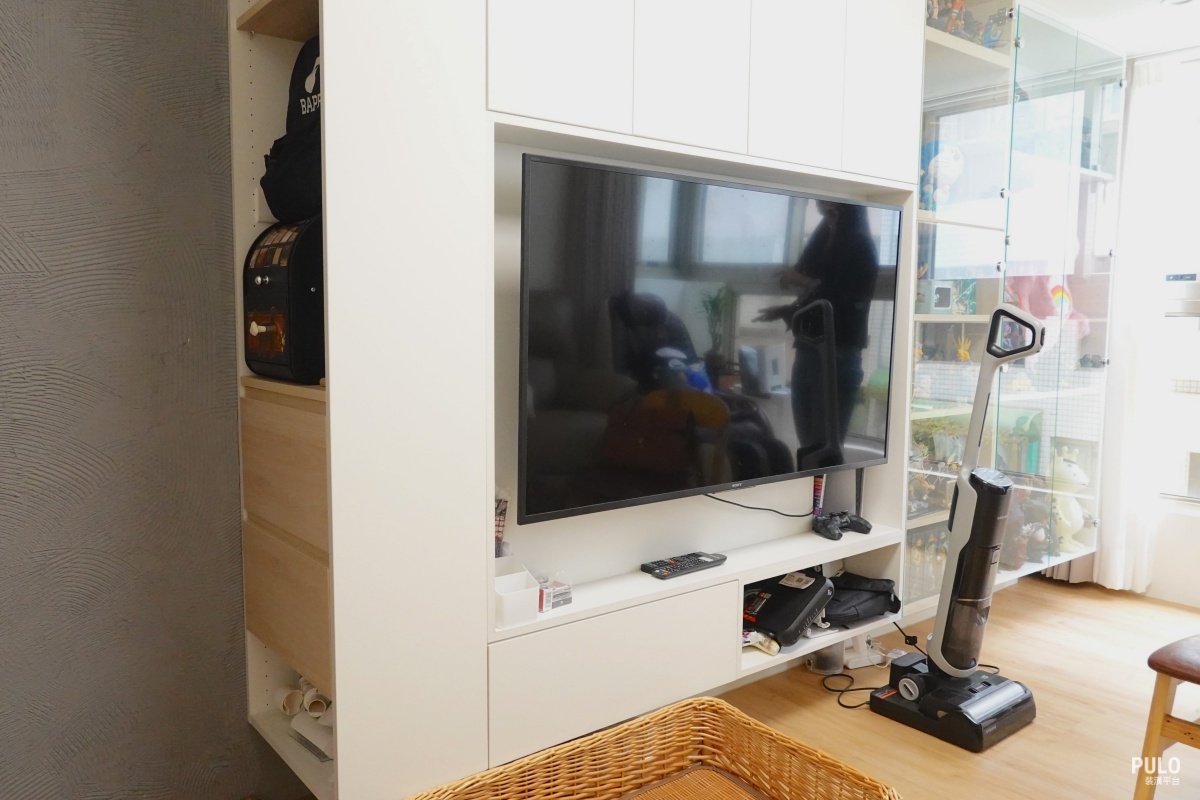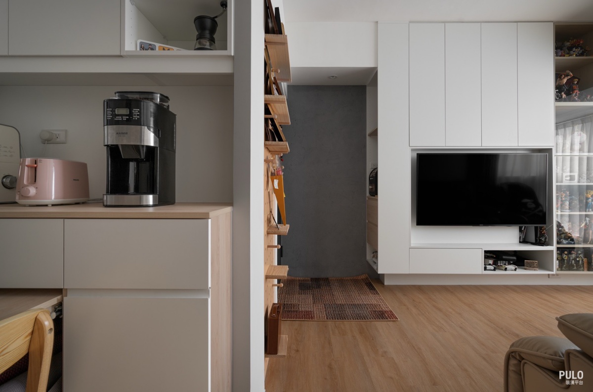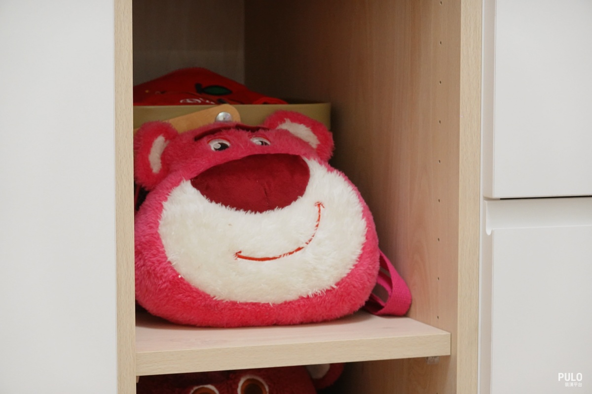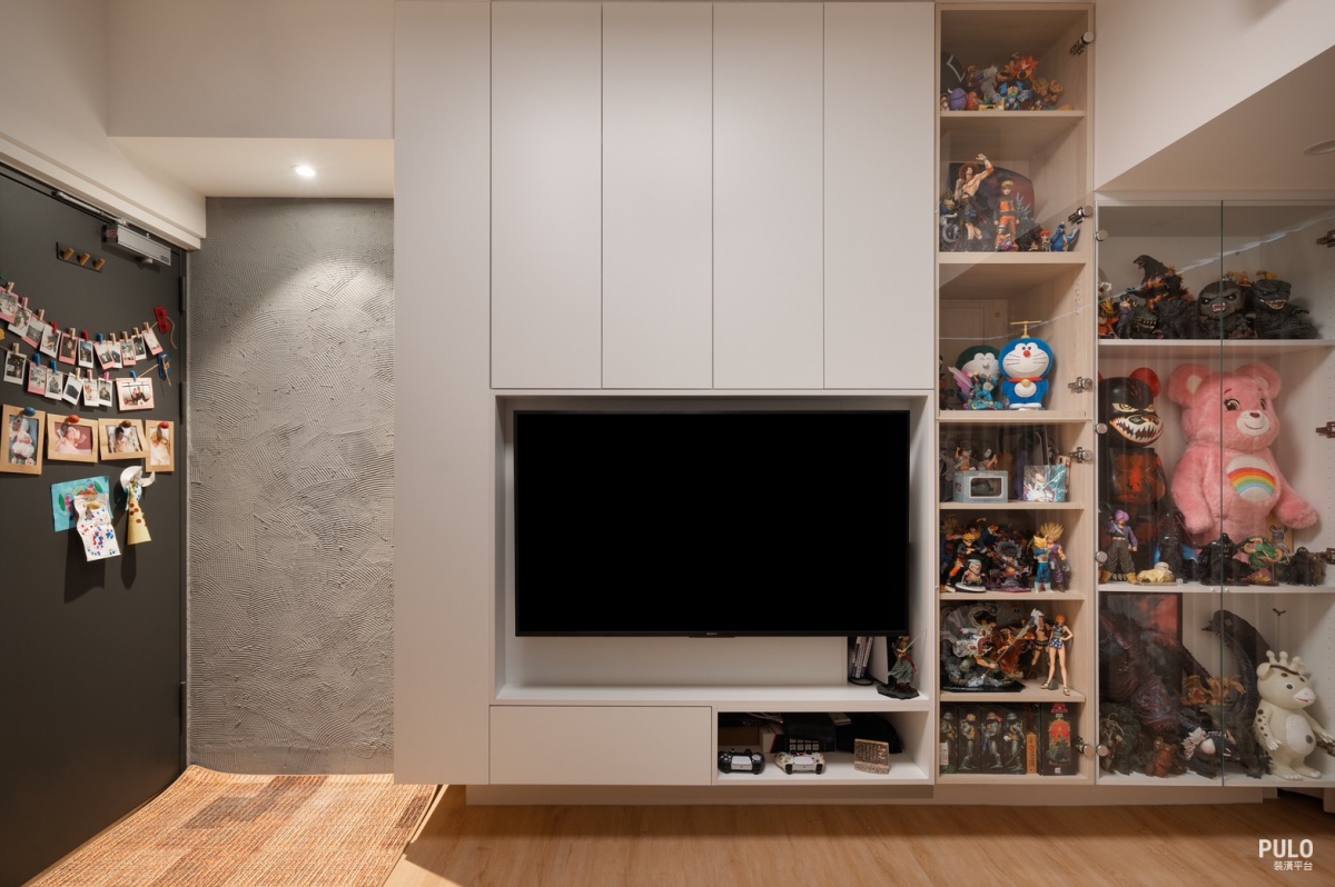 另外,從客廳、臥室、走道,甚至到電箱周邊,都規劃了系統櫃,不僅讓屋主的公仔收藏
