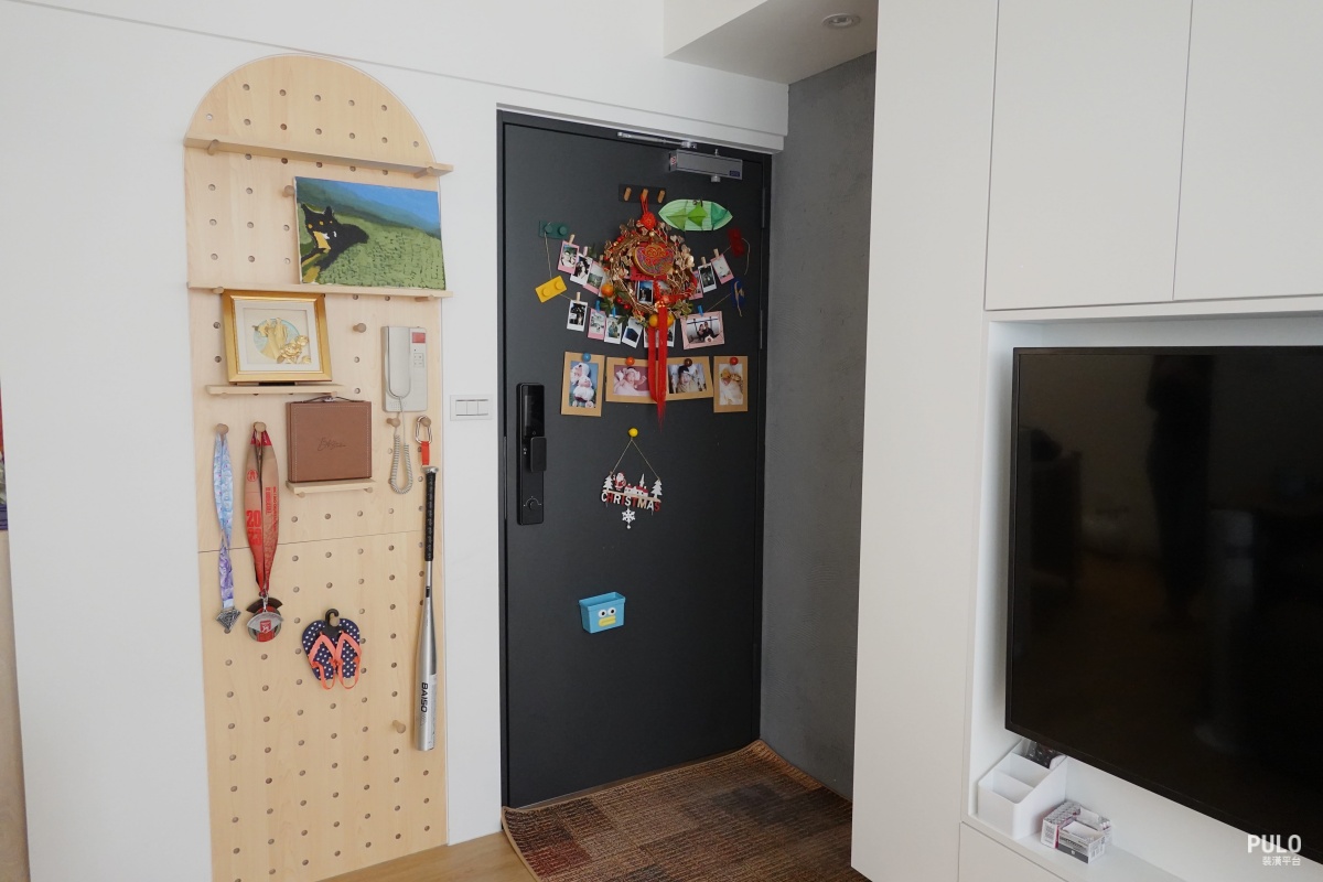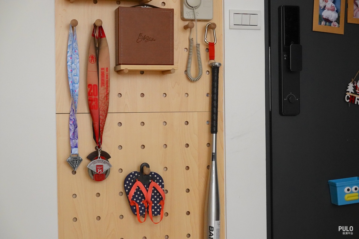 客廳的洞洞板則提供了彈性收納,同時也能擺上一家人參與活動的獎牌,將生活軌跡融入