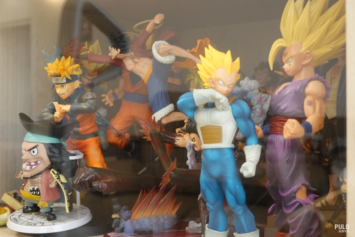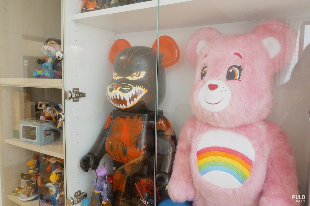 從玄關進來,首先看到的是一整排公仔展示櫃。設計上很聰明,利用公仔櫃做了界線,將