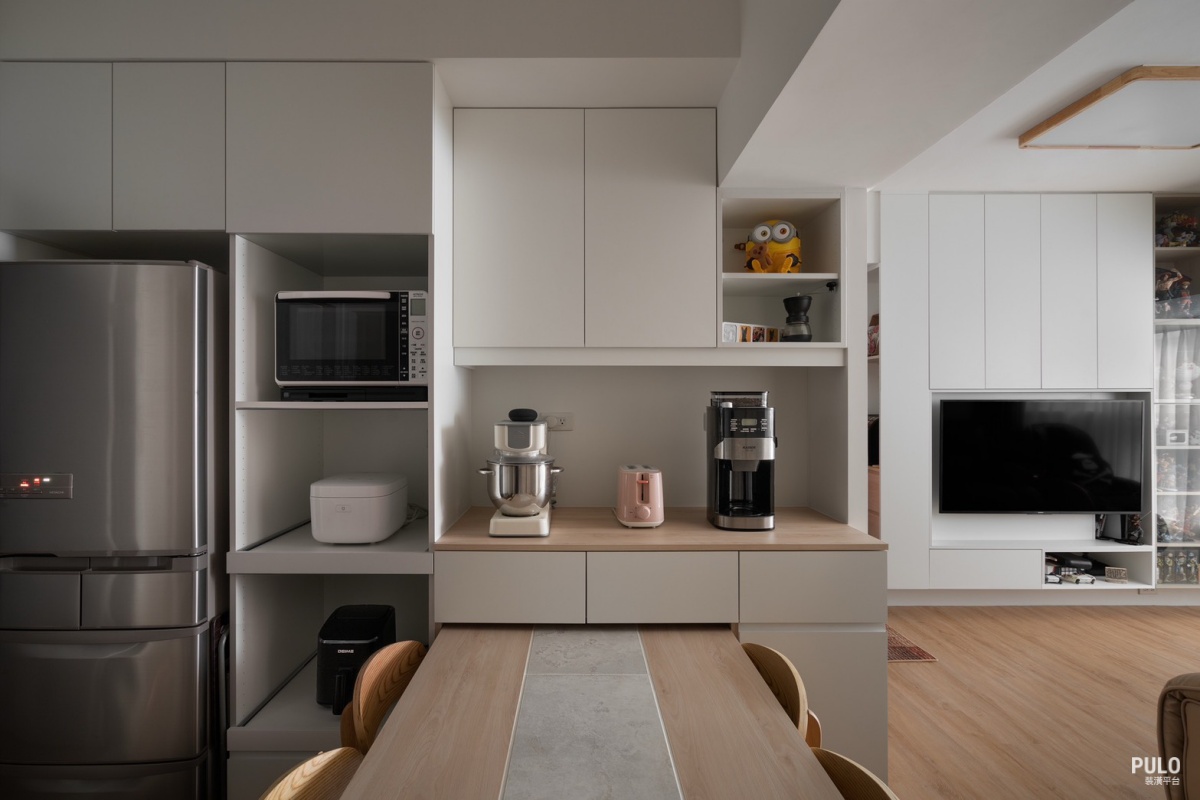 隱藏電器櫃,旁邊的電器櫃設計著重於隱藏收納,能把微波爐、氣炸鍋、餐具等全部收好