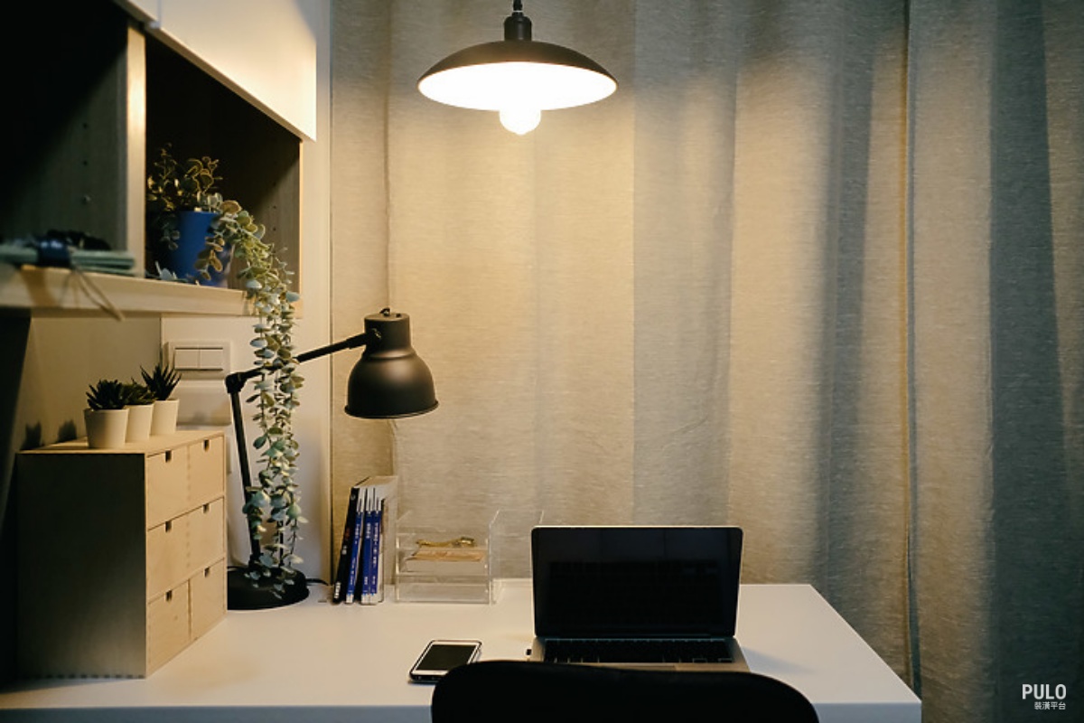 客廳裝設的是可調色溫與亮度的吸頂燈,於是不同照明下,在工作效率或創意發想之間,