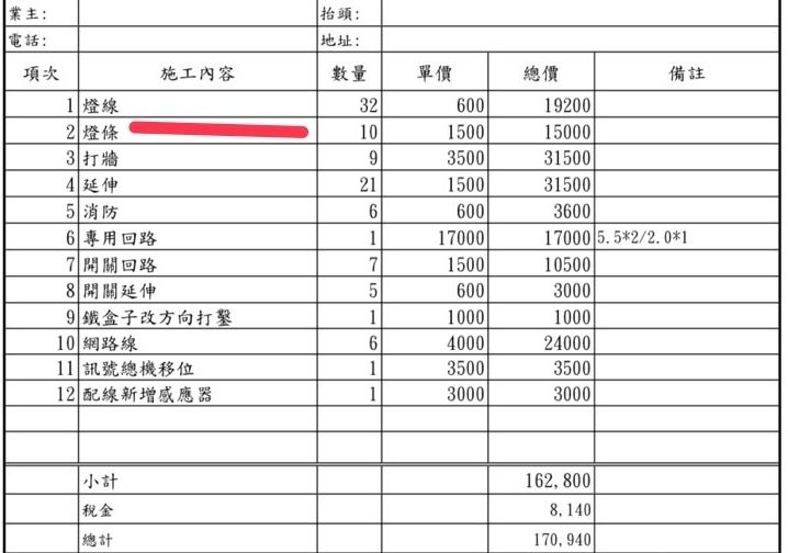 燈條的部分 後來我請水電解釋報價 各個工的收費如下(變壓器 燈條 感應器材料都是我