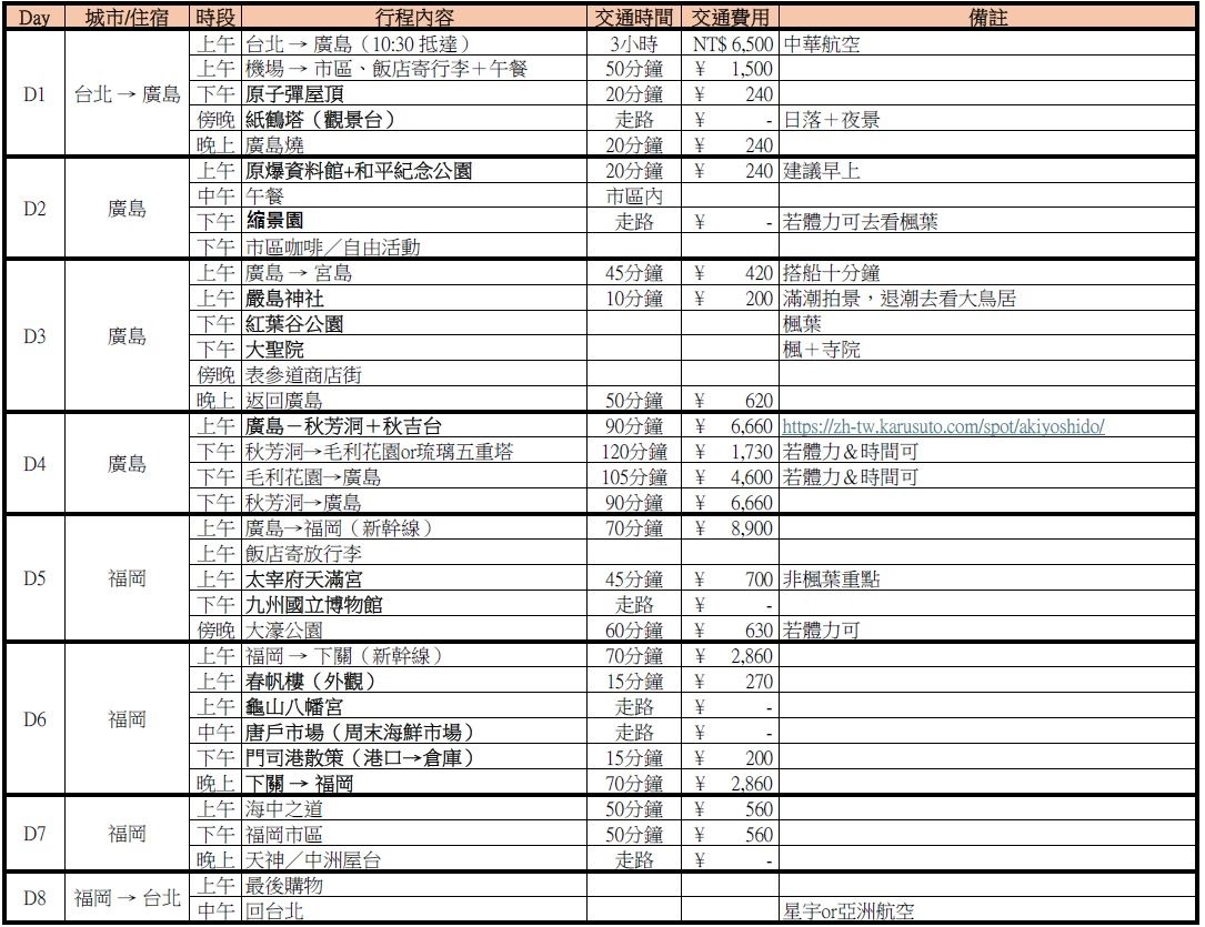[問題] 廣島北九州八天七夜行程請益