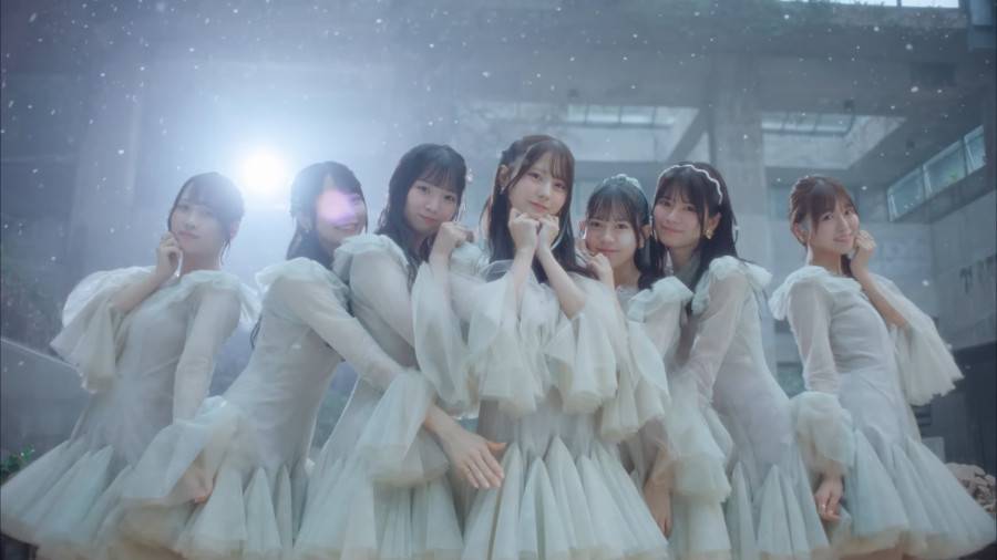 在紛飛的粉雪中,猶如夢幻遺跡般的建築裡,七人身著淡綠色服裝