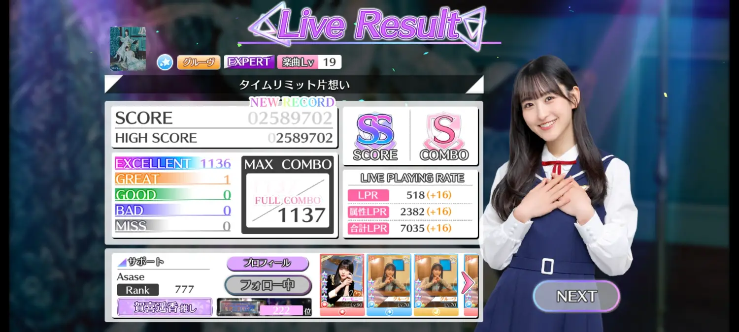 所選用的曲目為「タイムリミット片想い(EXPERT)」