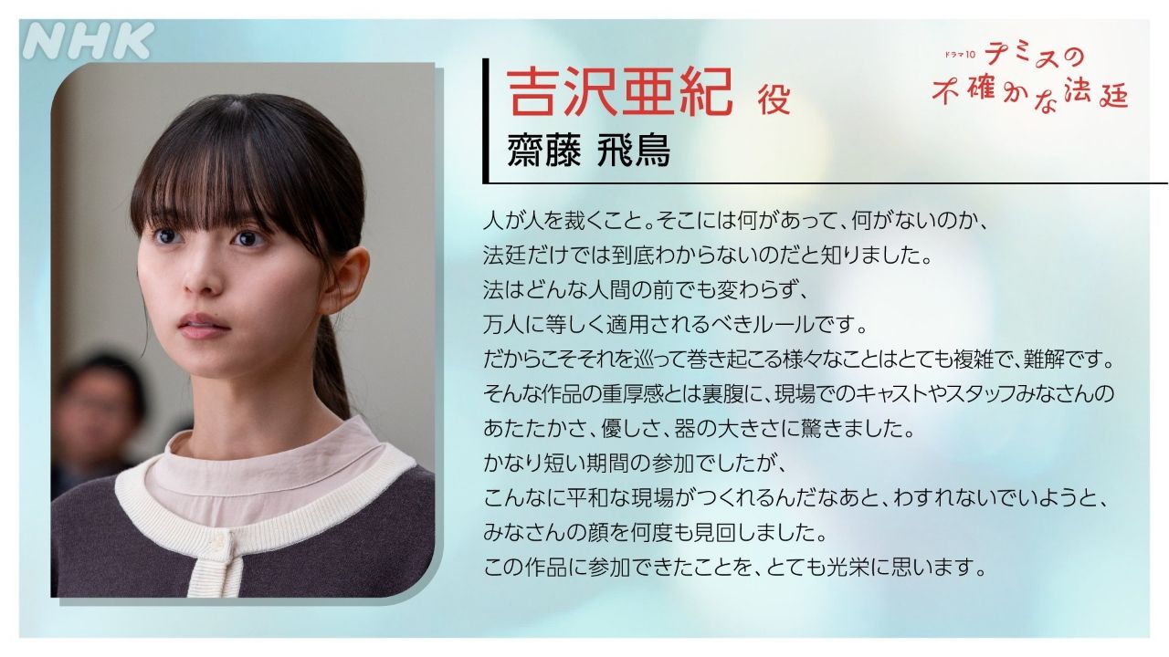 而從第 4 集起,首次出演 NHK 電視劇的 齋藤飛鳥,將挑戰飾演相信被指控為殺人犯的