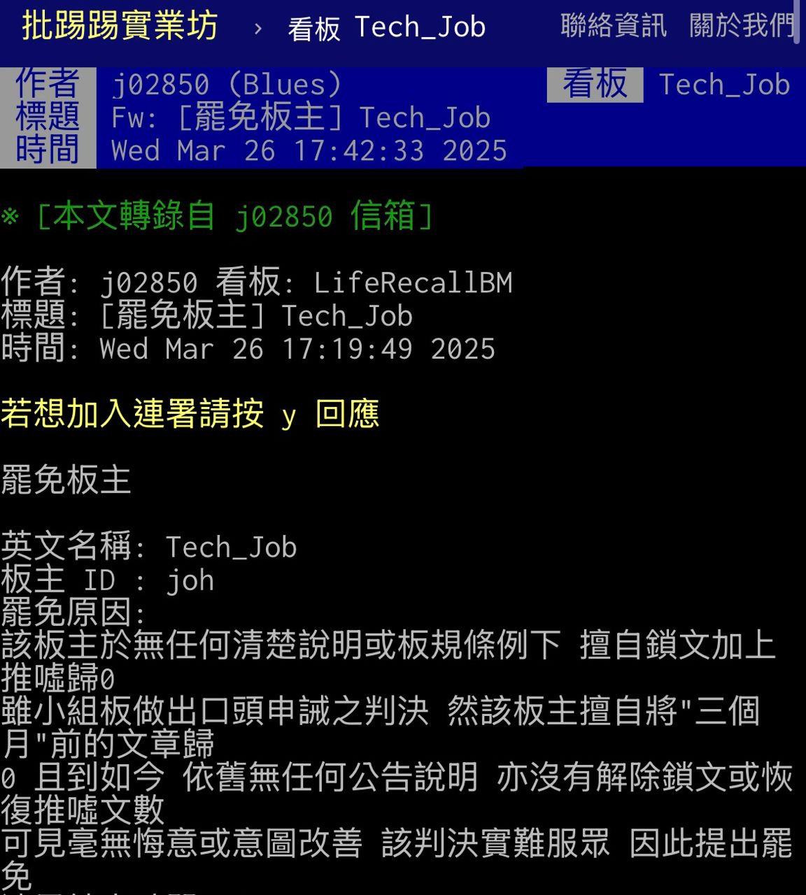 本人前於113年12月間開始,陸續於PTT網站以lobolin帳號發表「台達電人資和主管聯手