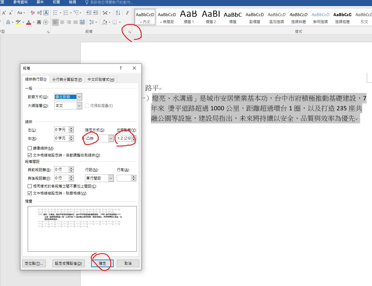 要改的段落框起來,按段落右下角小按紐,選凸排,調距離