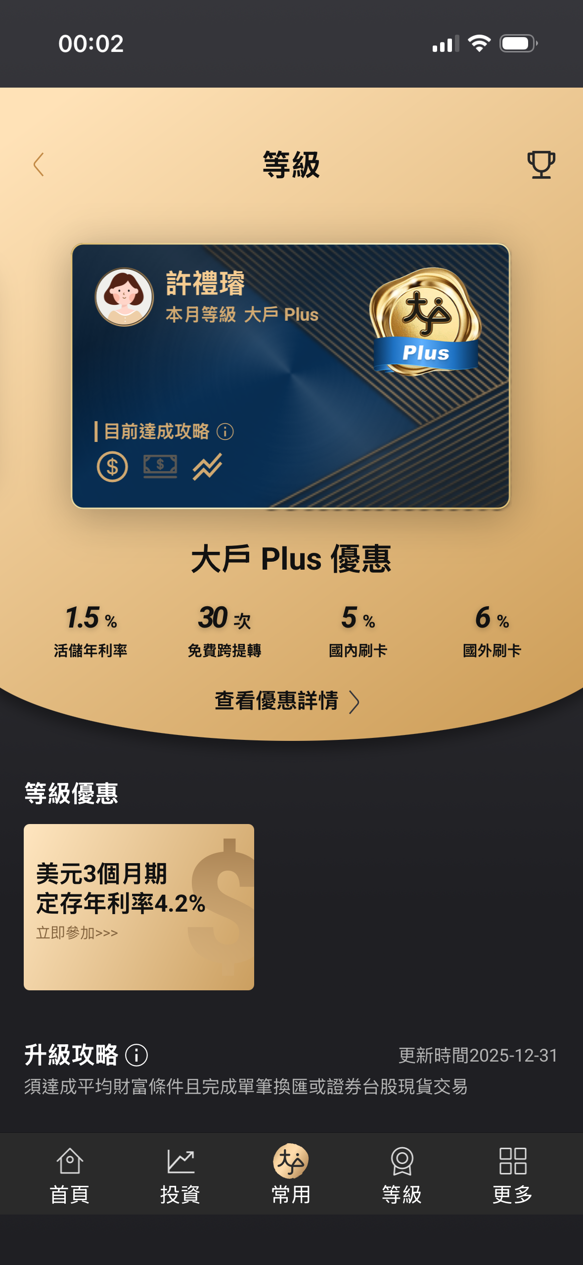 大戶Plus等級跨行轉帳/提款30次免手續費,大戶等級維持20次