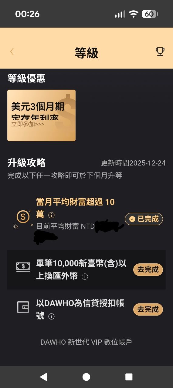 資產達100萬,每月需並完成外幣換匯5,000元(含以上)或綁定證券戶完成一筆台股交易。