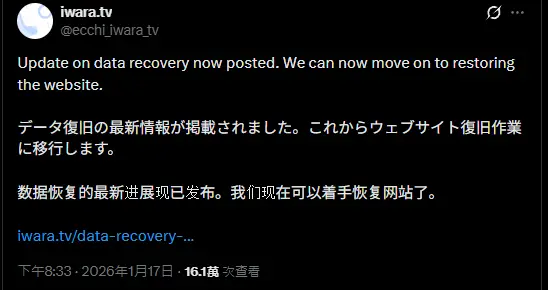 請大家繼續耐心等待。我們認為,相較於立即讓網站重新上線,資料復原必須優先處理。
