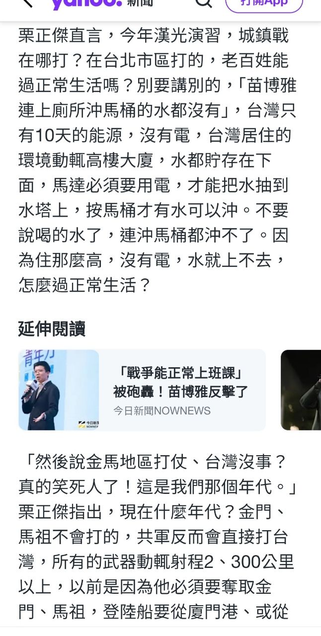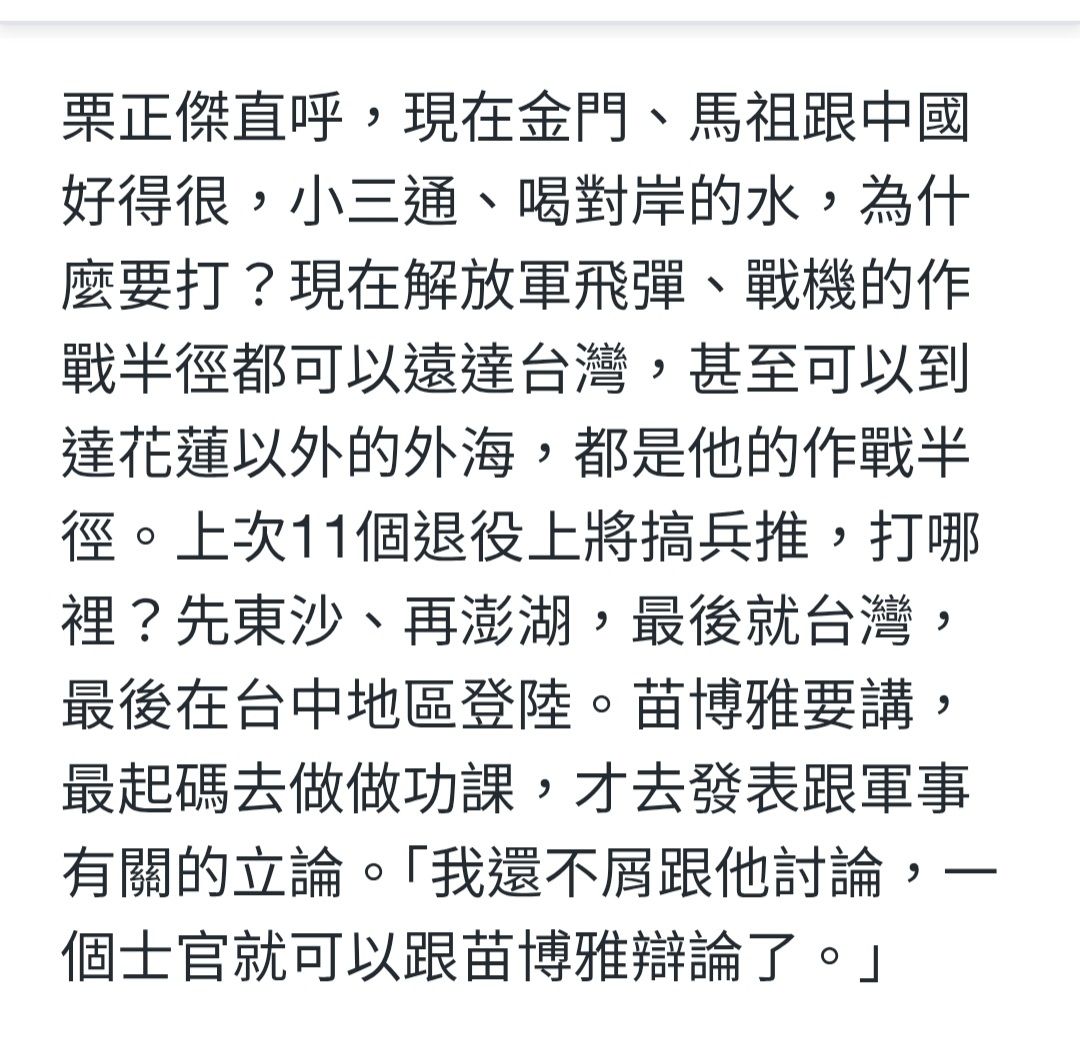 至於挨批美化戰爭的說法,苗博雅狠諷,現在主張和談、投降的人,等拿了中國的好處之