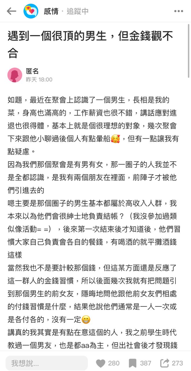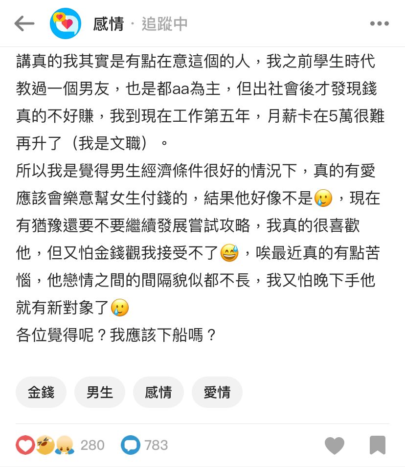 Re: [問卦] 台女:遇到很頂的男生,但金錢觀不合